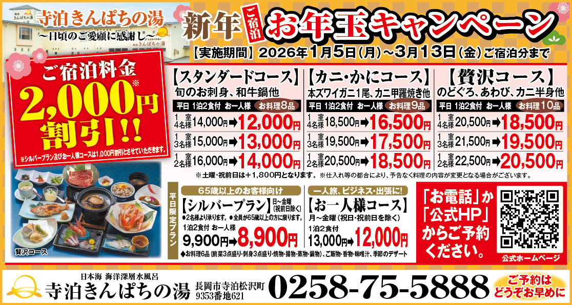 寺泊きんぱちの湯 「年末年始 ご宿泊 お年玉キャンペーン」