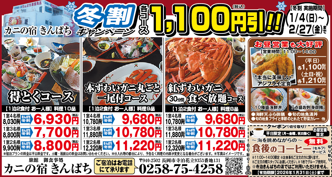 カニの宿きんぱち「冬割キャンペーン」令和8年1月4日〜2月27日まで