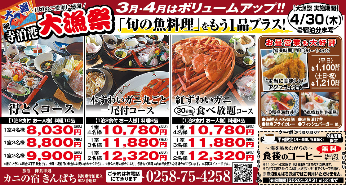 • カニの宿きんぱち「寺泊港 大漁祭」4月30日まで