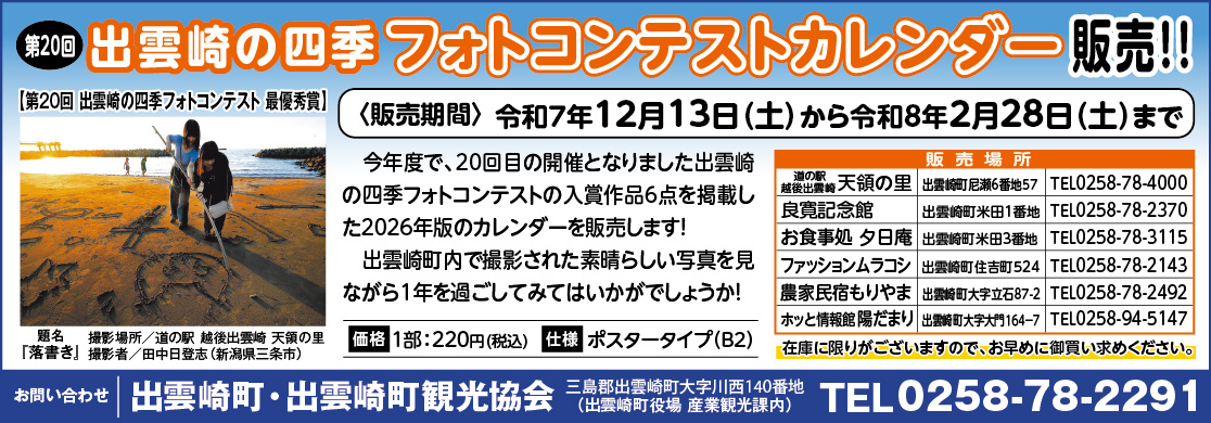 出雲崎町観光協会 「出雲崎の四季 フォトコンテストカレンダー」販売 令和7年12月13日〜令和8年2月28日まで