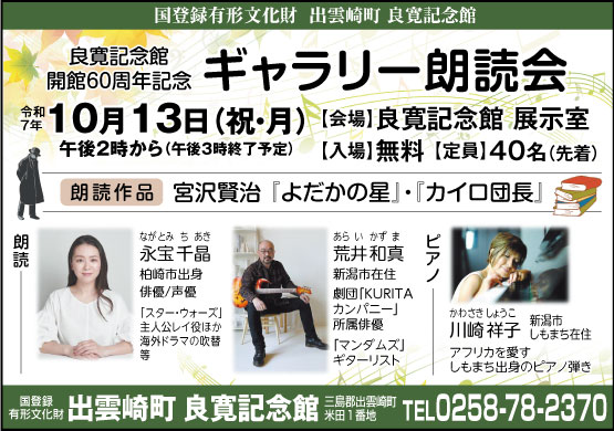 • 出雲崎町 良寛記念館 開館60周年記念「ギャラリー朗読会」10月13日