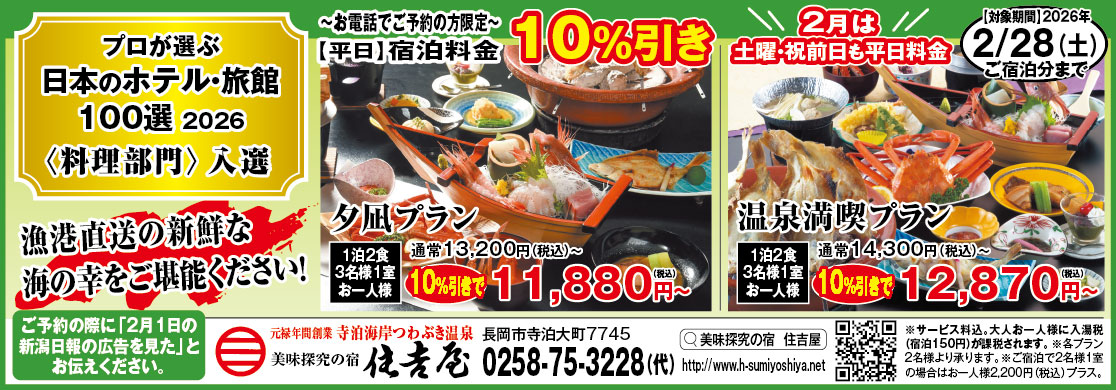 海風亭 寺泊 日本海 「春のものまねショー」3月14日、冬期限定ご宿泊プラン「蟹(かに)食べ放題」3月31日まで